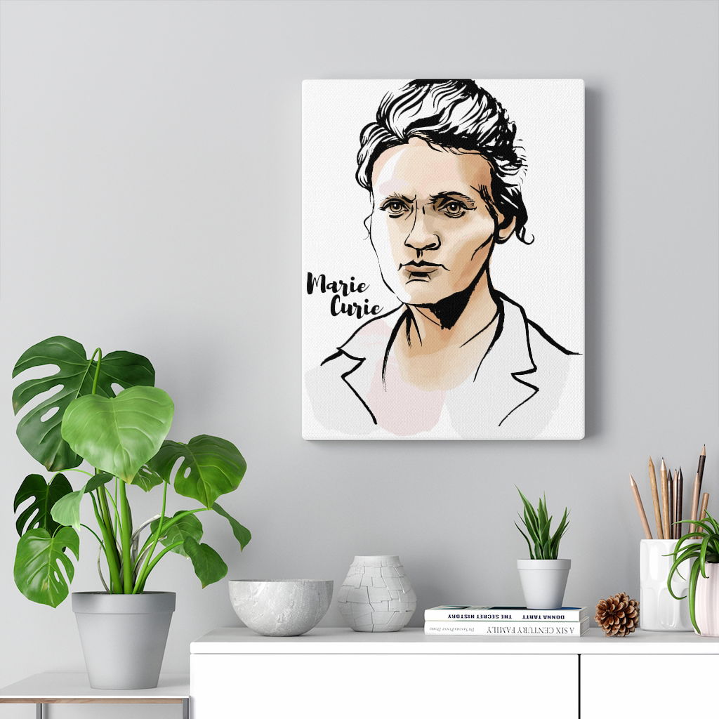 Spectacular canvas gallery wraps of historical Scientist Marie Curie, Painting Art Print Gallery Wrapped Canvas. A perfect addition to every room! Our standard canvas is made from a finely textured artist-grade cotton substrate which consistently reproduces image details with outstanding clarity and detail. A must have Wall Art Office Décor or Home Decorations for science lovers 🙂